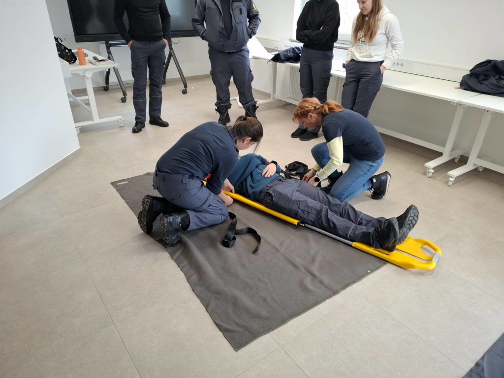 Na tretji postaji smo se posvetili krvavitvam, nameščanju vakuumskih opornic ter medeničnega pasu. Udeleženci so se preizkusili v obvladovanju različnih vrst krvavitev ter pravilni stabilizaciji poškodb okončin in medenice.
