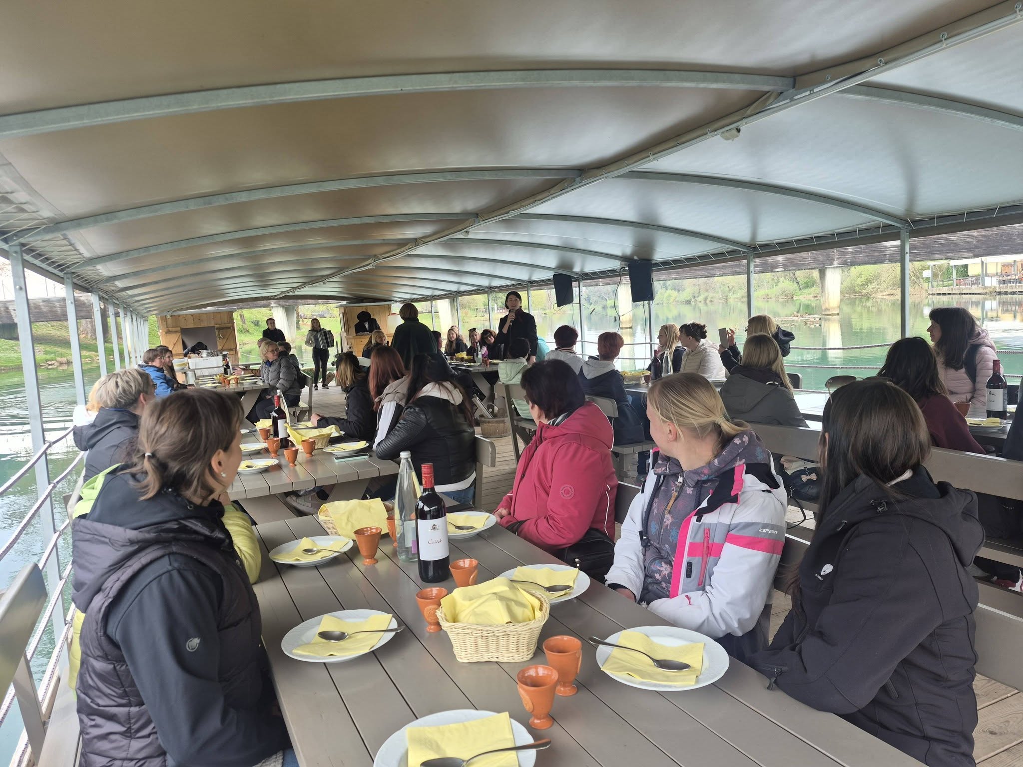 Sledilo je nepozabno splavarjenje po reki Krki okoli starega mestnega jedra, kjer smo uživale ob prijetni glasbi, dobri družbi, cvičku in okusnem dolenjskem kosilu. Našo predsednico Mojco Kovačič so ob tem sprejeli med Rudolfove splavarje.
